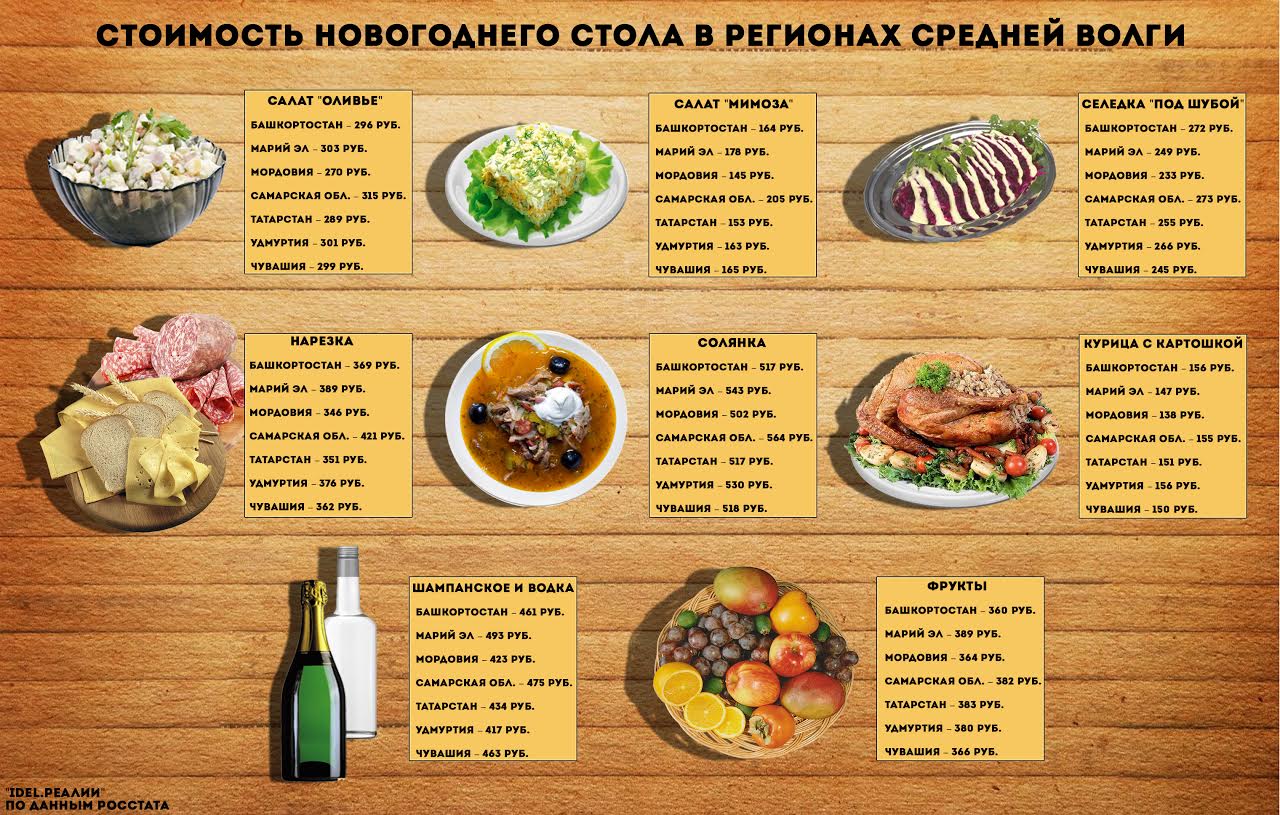 "Idel.Реалии" решили посчитать, во сколько обойдется приготовление традиционных новогодних блюд в разных регионах Средней Волги. Спойлер – едем закупаться в Мордовию, особенно если вы из Самары. Запеченная в духовке курица с картофелем: курица 1 кг, чеснок, 1 кг картофеля, 2 столовых ложки майонеза. Солянка: говядина 700 г, полукопченная колбаса 200 г, вареная колбаса 300 г, лук 150 г, соленые огурцы 100 г, оливки 100 г, томатная паста. Салат "Оливье": вареная колбаса 400 г, зеленый горошек 1 банка, яйца 5 штук, морковь 200 г, картофель 300 г, соленые огурцы 200 г, майонез. Салат «Селедка под шубой»: сельдь 500 г, свекла 300 г, лук 150 г, яйца 4 шт, картофель 200 г, морковь 150 г, майонез. Салат "Мимоза": сайра 1 банка, картофель 300 г, морковь 200 г, лук 150 г, яйца 4 шт, майонез. Нарезка: полукопченная колбаса 500 г, сыры 500 г. Алкоголь: шампанское 750 мл, водка 500 мл. Фрукты: бананы 1 кг, виноград 1 кг, яблоки 1 кг, апельсины 1 кг. Весь набор блюд в расчете на пять-шесть порций обойдется в этом году в Башкортостане в 2 596 рублей, в Марий Эл – в 2 691 рубль, в Татарстане – в 2 533 рубля, в Удмуртии – 2 591 рубль и в Чувашии – в 2 570 рублей. Дешевле всего покупать продукты в Мордовии – 2 422 рубля, а дороже – в Самарской области – 2 809 рублей. По информации Росстата.