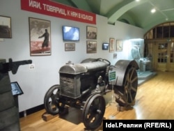 Витрины соседствуют с трактором "Фордзон-Путиловец", а над всей этой частью зала, посвященной коллективизации и репрессиям, висит кумачовый лозунг: "Иди, товарищ, к нам в колхоз!"