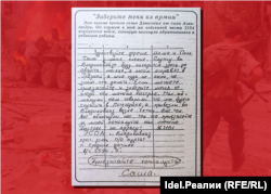 "Здравствуйте, дорогие мама, папа. Не падайте в обморок. Я с 15 июня нахожусь в Чечне. Сопровождаю основную колонну, которая направляется в Шали. В моем распоряжении 27 солдат. Все ребята хорошие, поддерживаем друг друга, все понимаем, где находимся. Обещаю вернуться в срок. Адрес мой изменится, пока мне не пишите. Целую, Айдар".