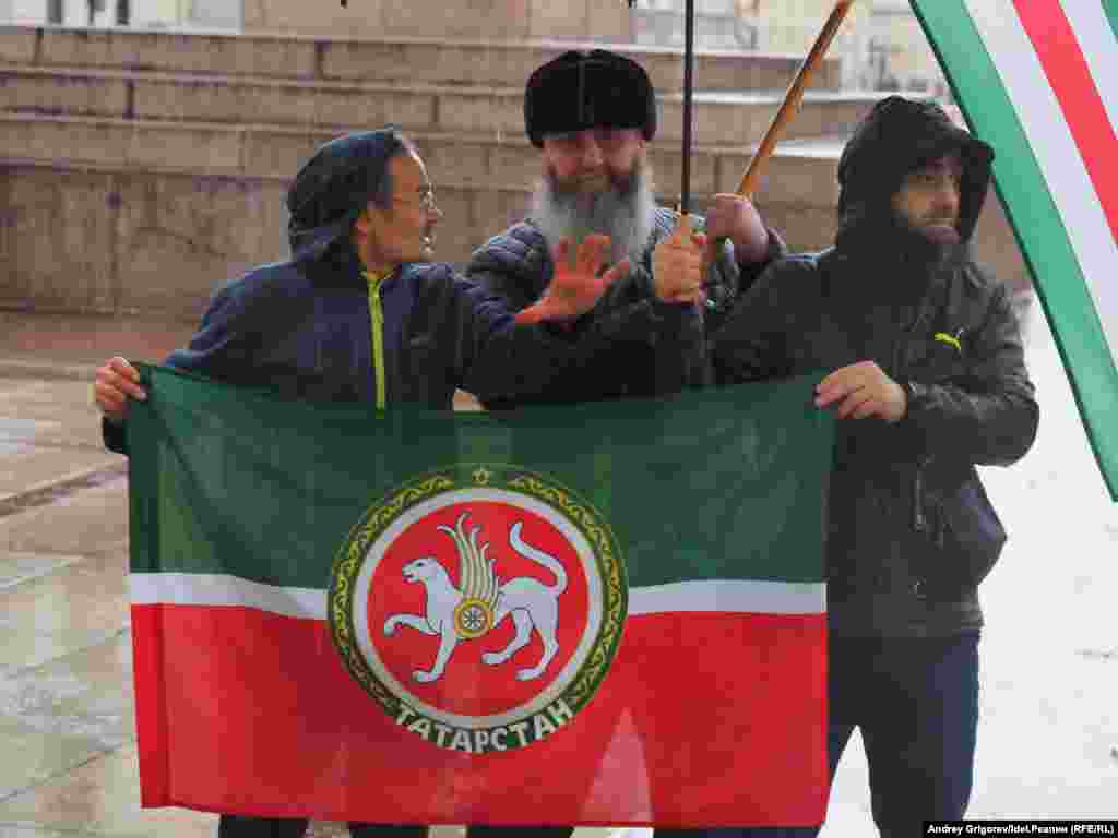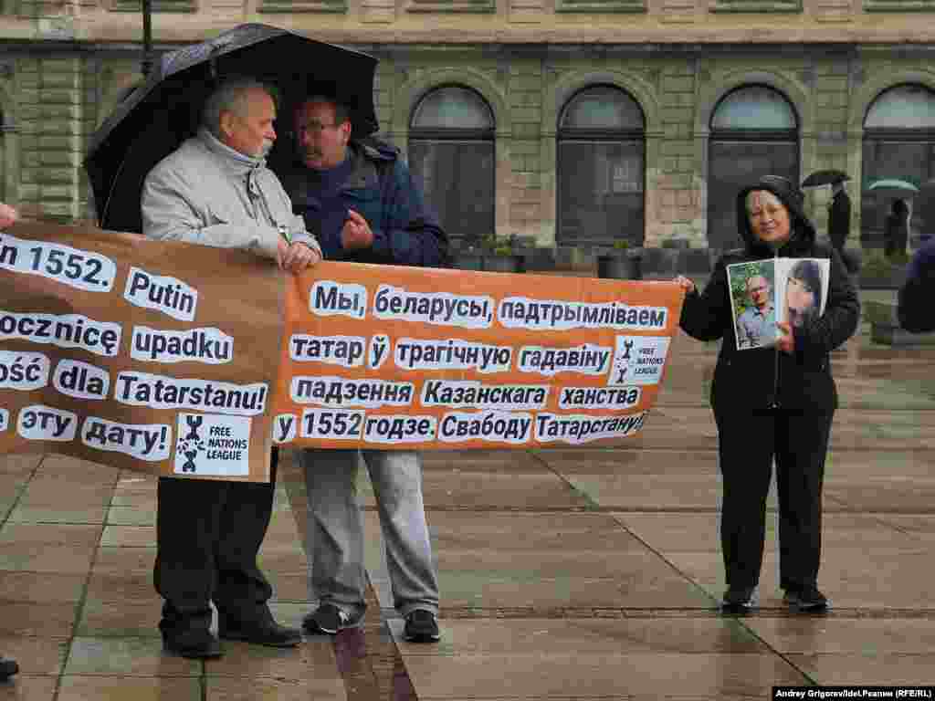 Всего, несмотря на проливной дождь, собралось более тридцати человек, которым Нафис Кашапов раздал плакаты собственного изготовления. Надписи на плакатах были сделаны на разных языках — русском, татарском, украинском, белорусском, польском, английском.